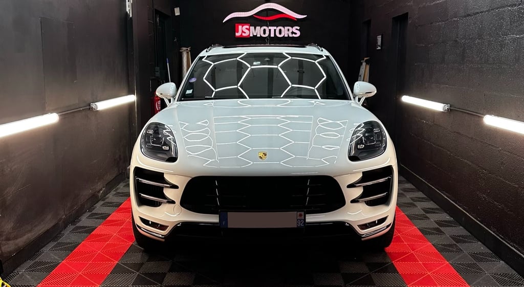 ⚪ Porsche Macan Turbo blanche – Polissage Stage 1 chez JS Motors près de Saint-Germain-en-Laye